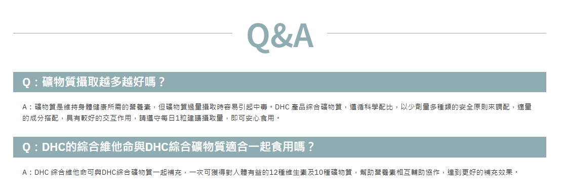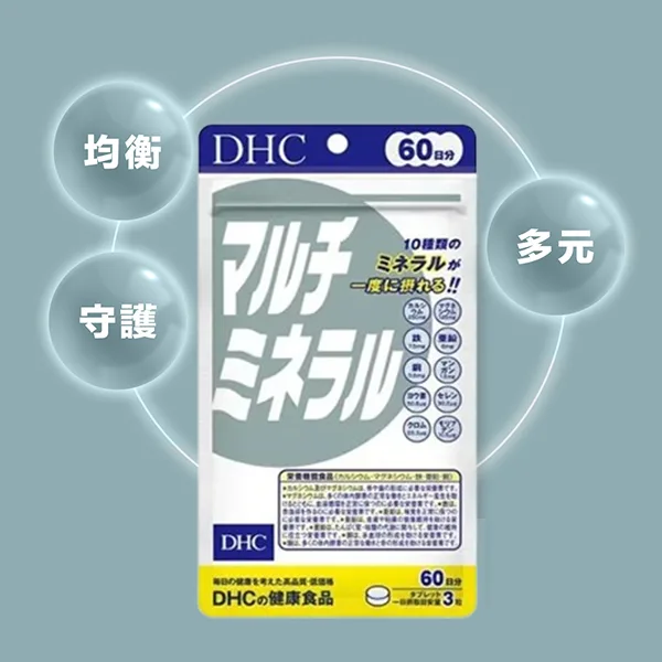 DHC 綜合礦物質均衡補充日常飲食中容易缺乏的營養,維持身體機能正常運作。每粒含有 鈣、鐵、鋅、銅、錳、鎂、鉻 等 10 種必需礦物質,幫助調節生理機能,改善亞健康狀態,常保年輕活力。