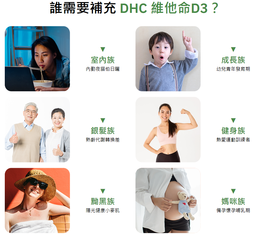 DHC 維他命D每日一粒,有效促進鈣吸收,是維持骨骼、牙齒及身體組織健康的重要營養素。搭配 DHC 10 大系列保健食品,包括維生素、魚油、草本精華等,滿足全方位健康需求。